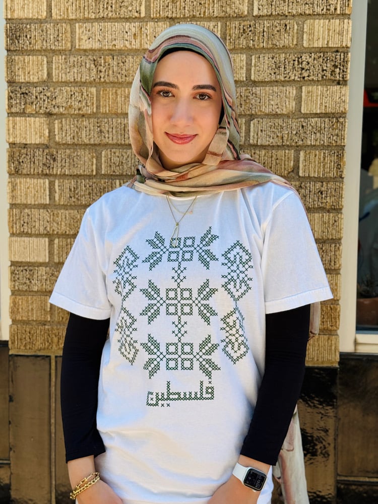 This shirt was designed by Zaytoon UW, a Palestinian-led student organization at the University of Washington, as part of our effort to support displaced Gazan students coming to UW. These students were admitted under an agreement that came out of last year’s Liberated Zone where UW committed to waiving tuition for at least 20 students from Gaza.